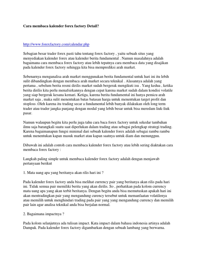 7/31/ · Cara Membaca Kalender Forex Factory – Bagi para pemain forex, pengetahuan dalam membaca kalender forex tentunya sangat penting. Dengan mengetahui hal tersebut, kita bisa lebih yakin saat masuk market. Namun perlu digaris bawahi sinyal dari news yang muncul dalam kalender forex, sebaiknya tidak dijadikan sebagai acuan utama dalam menentukan blogger.comted Reading Time: 3 mins 5/19/ · Mengetahui bagaimana cara membaca kalender ekonomi forex secara tepat itu penting untuk memaksimalkan analisis dan strategi trading anda sebelum dan setelah perilisan yang paling penting. Memeriksa kalender setiap pagi akan memungkinkan anda untuk membiasakan diri dengan acara yang akan datang tersebut 11/26/ · Cara Kerja Kalender Ekonomi Kalender Ekonomi adalah daftar peristiwa dan perilisan data yang sudah dijadwalkan. Ada banyak peristiwa di dalamnya, mulai dari laporan PDB dan angka Non-Farm Payroll yang memengaruhi keseluruhan ekonomi, sampai hal-hal lain seperti data penjualan grosir (Wholesale Sales) yang menyebabkan perubahan sangat kecil pada pasar